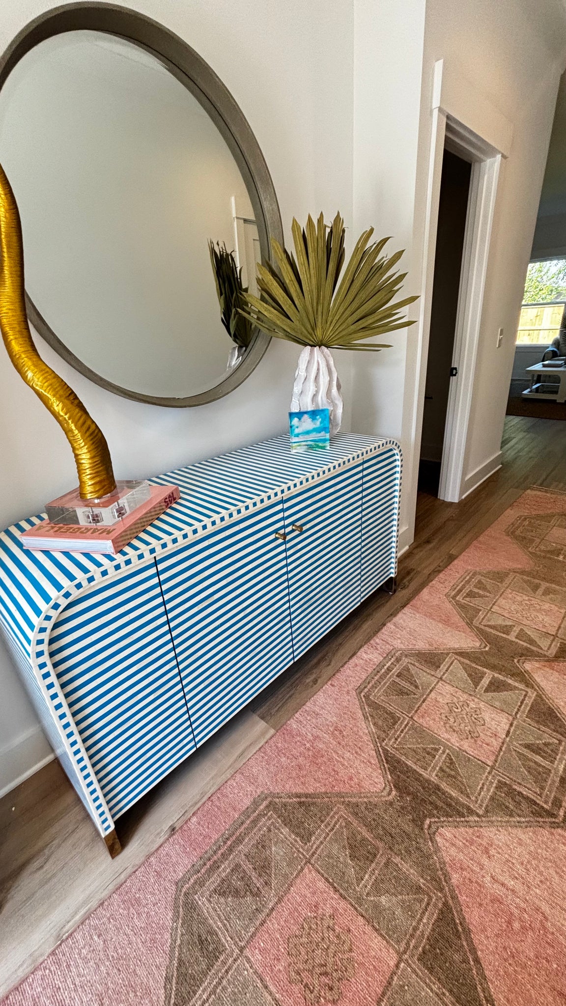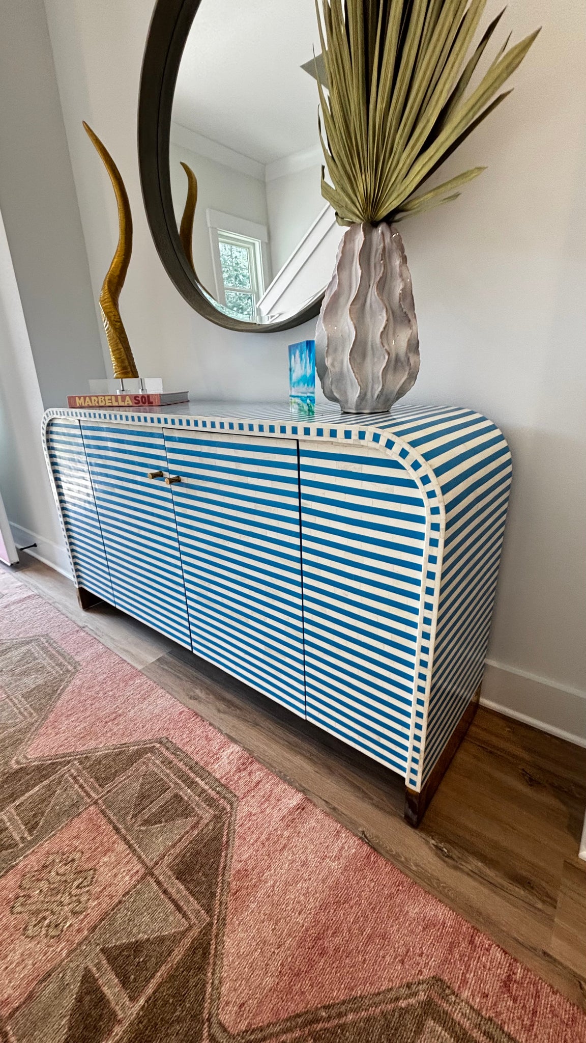Featuring intricately patterned mother-of-pearl and bone inlay alongside defining brass hardware, this two door buffet exudes unparalleled craftsmanship. Artistic and functional at once, it makes a stunning statement in an entryway, or provides ample storage for small-space living rooms.