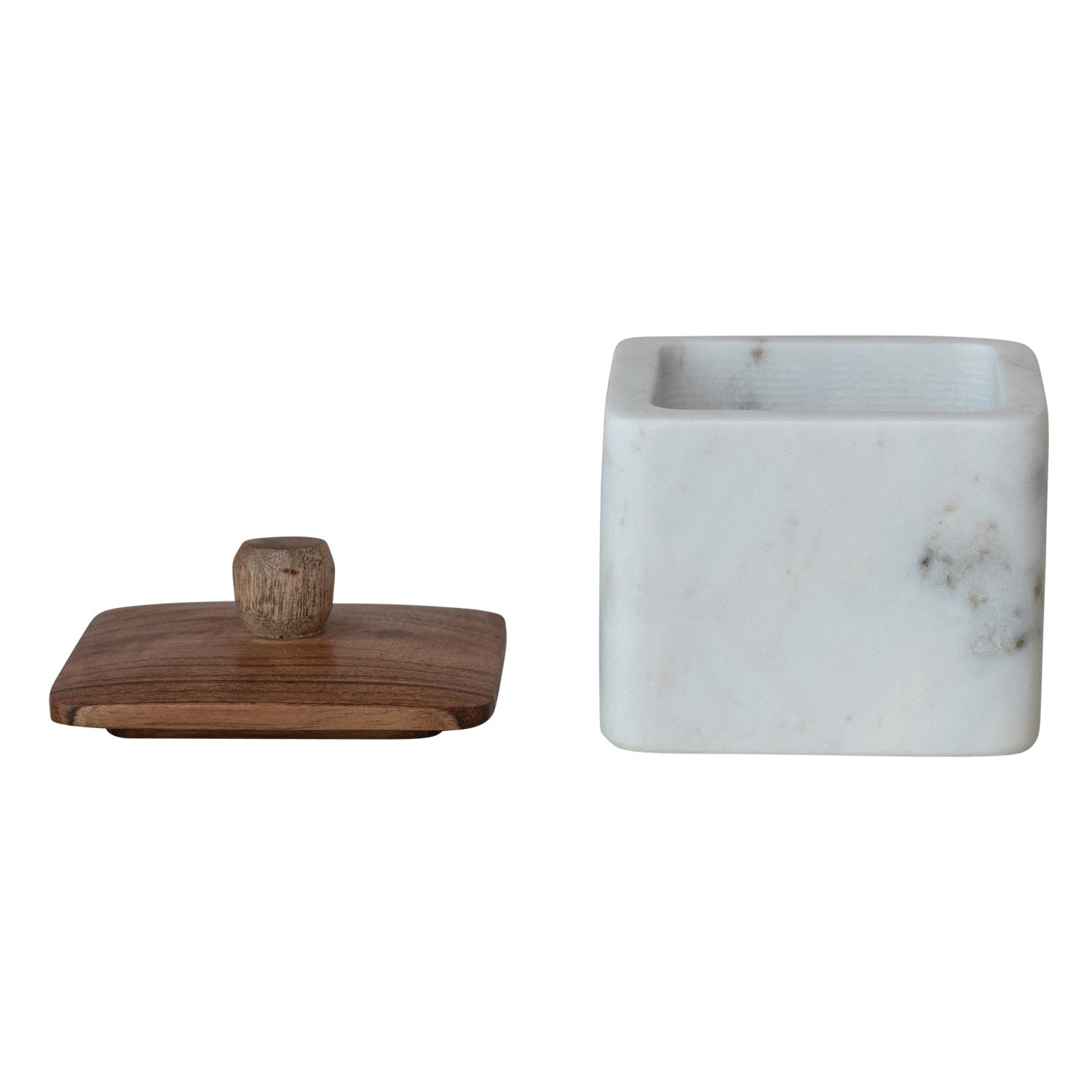 4" Square x 4-1/4"H Marble Container w/ Acacia Wood Lid, White & Natural