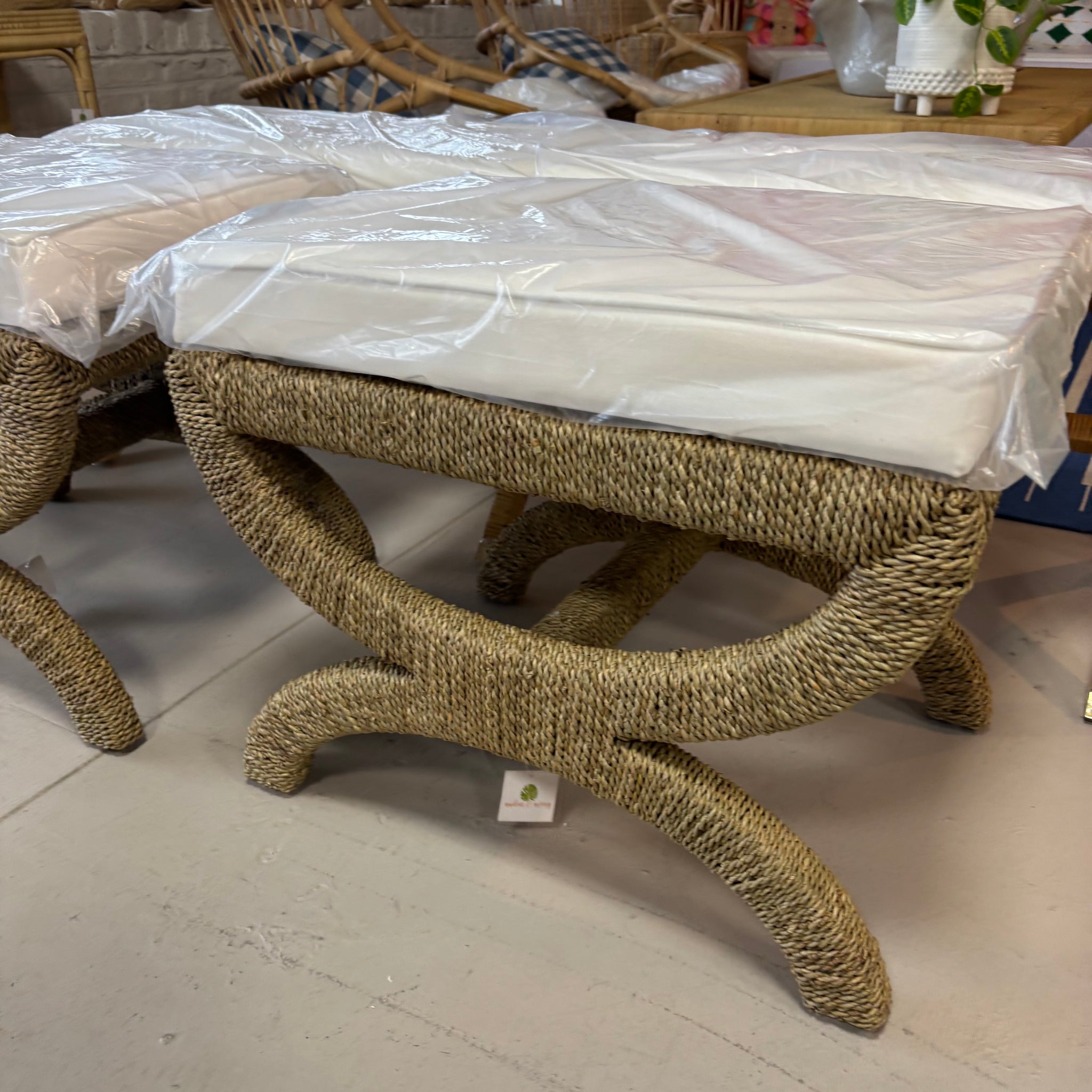The Palm Beach Stool marries organic design with refined functionality. Its hand-woven seagrass construction creates natural sculptural appeal—lightweight yet structurally sound—while the contract-grade cushion top ensures lasting comfort and performance. The piece transitions effortlessly across interiors: position it as bedroom seating, tuck beneath a console table, or anchor a living room vignette. This is coastal minimalism with substance, where artisanal craftsmanship meets practical elegance for spaces that demand both beauty and resilience.