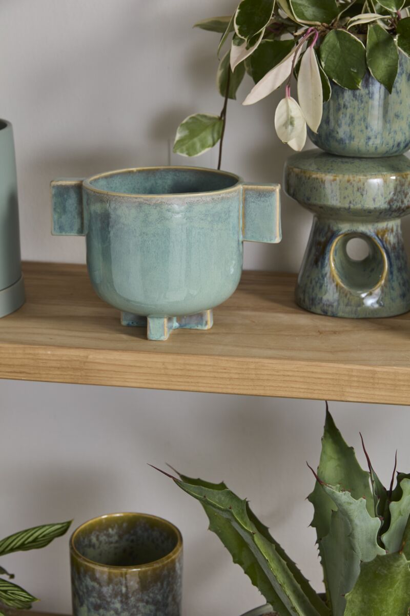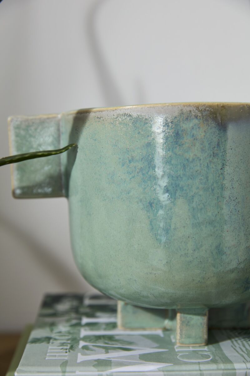 The sculptural design and eye-catching color of the Trothos Pot will make any plant stand out in a plant lover's collection. A glossy, seafoam green reactive glaze is applied all over and shows hints of warm undertones along the rim of pot and the corners of 2 hand applied rectangular tabs. The base of the pot features a T-shaped foot that gives a little extra height when layered with other pots for a unique and artful collection.